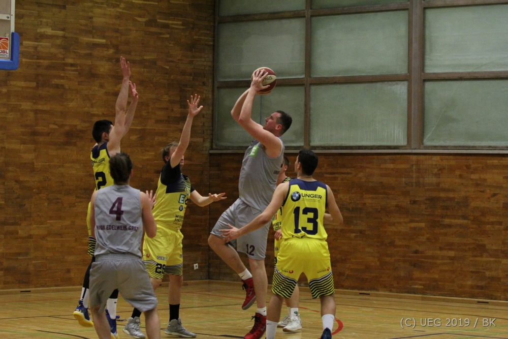 Nach der Pause versucht der UBSC Graz 1 vermehrt sein bekannt aggressives Spiel zu forcieren und macht viel Druck auf die Ballführenden. UEG tritt dem aber routiniert entgegen, kann die Pressingverteidigung souverän ausspielen und sein Spiel aufbauen. In dritten Abschnitt geht viel über die Mitte mit DeMarinis und Kügerl, im Schlußabschnitt punkten wieder vermehrt die Außenspieler und UEG kann mit einem 74:40 (48:18) einen deutlichen Sieg einfahren.